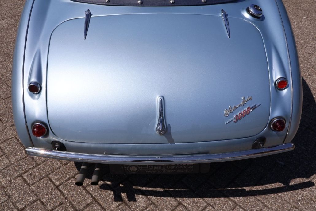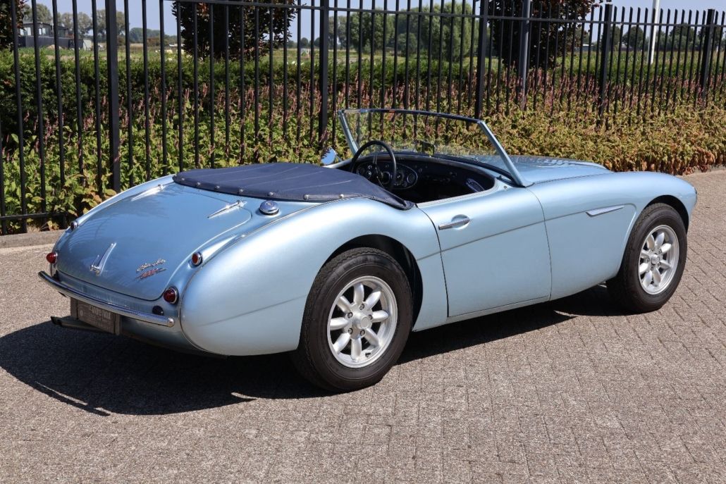 The Austin Healey 3000 MK1 BT7 (1959) 'Big Healey' with a 2+2 configuration. This example, built in August 1959, is a fully matching-numbers car with chassis, body, engine, and ignition key aligned to factory records. Imported from the USA in 2019 and subjected to a meticulous body-off restoration, it is now ready for road use in the Netherlands (registered 2023). Powered by a 2,912 cc six-cylinder engine producing around 124 BHP, paired with a four-speed manual gearbox with overdrive. Notable options include Minilite rims with Michelin X-AS tyres, leather-trimmed seats, dash and steering wheel, electronic ignition, and other features, with original items supplied with the car. Exterior blue metallic with blue interior, 15-inch chrome wire wheels, and high-end finishing throughout.