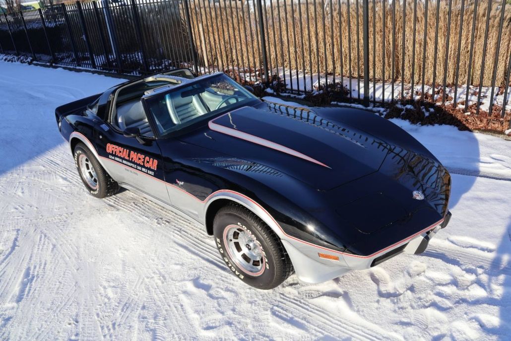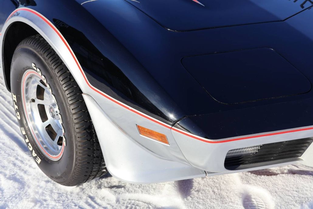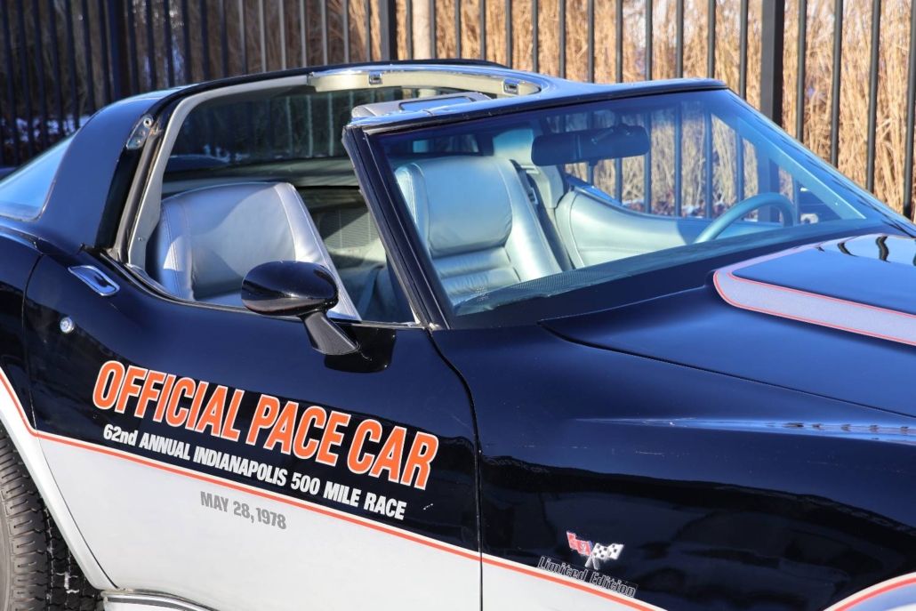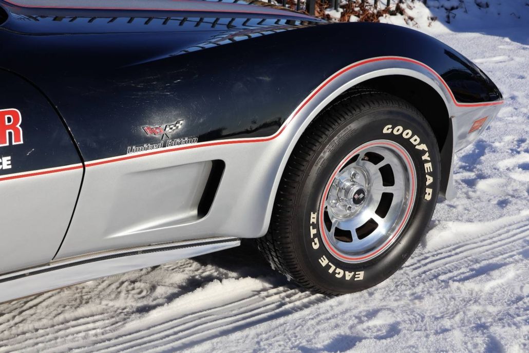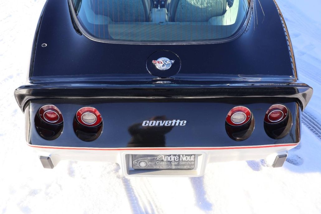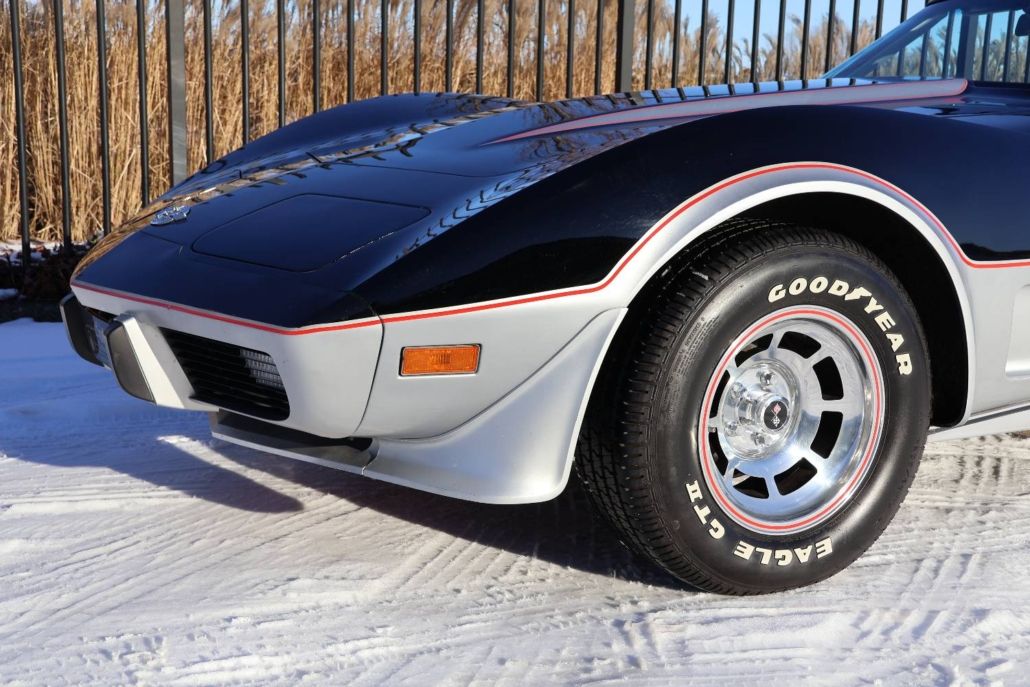 Chevrolet Corvette C3 targa silver anniversary edition from 1978. The model is the 25th anniversary edition, of which 6,502 units were produced. This matching numbers car has around 12,340 miles on the odometer and is in top original condition with original paintwork and interior. It is powered by a 5.7 liter L48 V8 engine delivering 185 hp, paired with a three speed automatic transmission. Top speed about 190 km/h. The car was the pace car for the Indianapolis 500 in 1978 and was displayed in the Technik Museum Sinsheim in Germany. It features a long black hood, two tone exterior black and silver, Silvergray leather interior, and 15 inch alloy wheels. Chassis number IZ87L8S901582. This is a unique item for any Corvette collection and is available for viewing in our showroom.