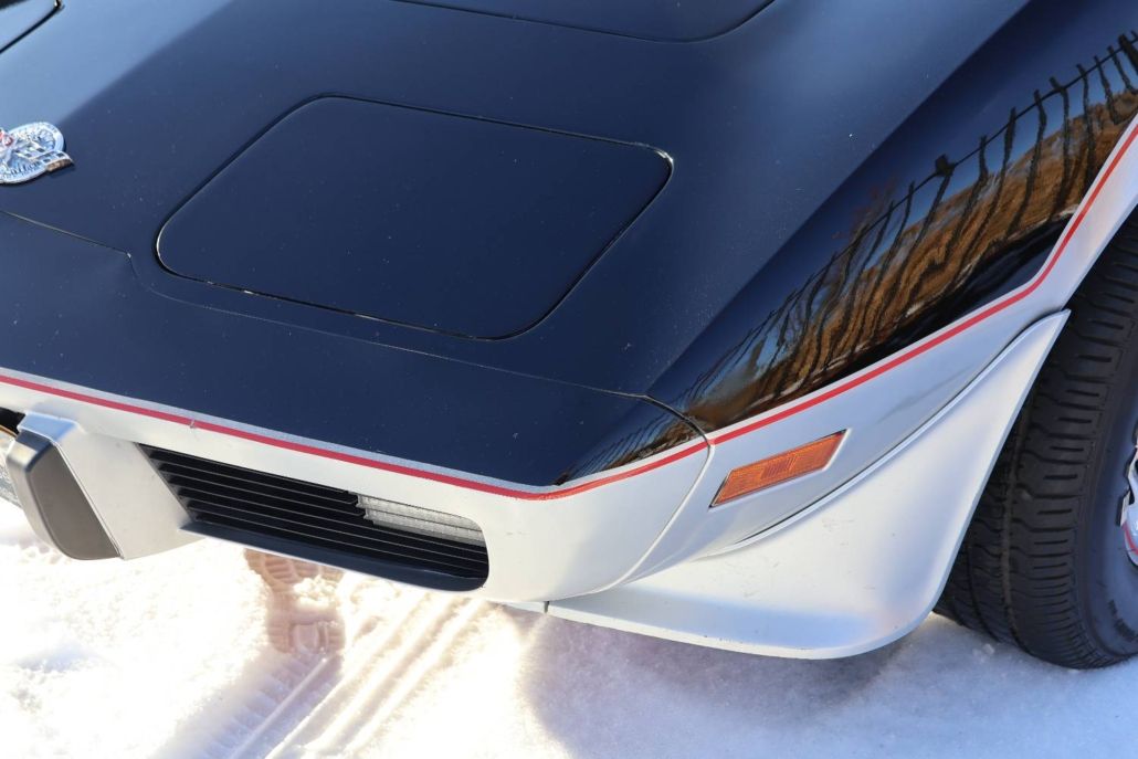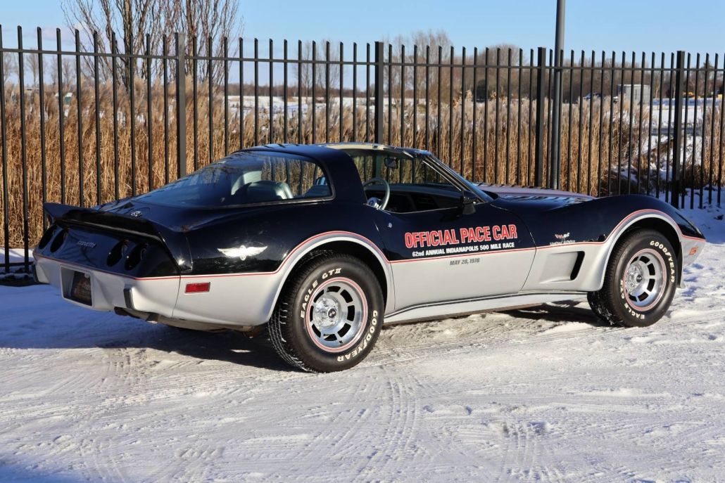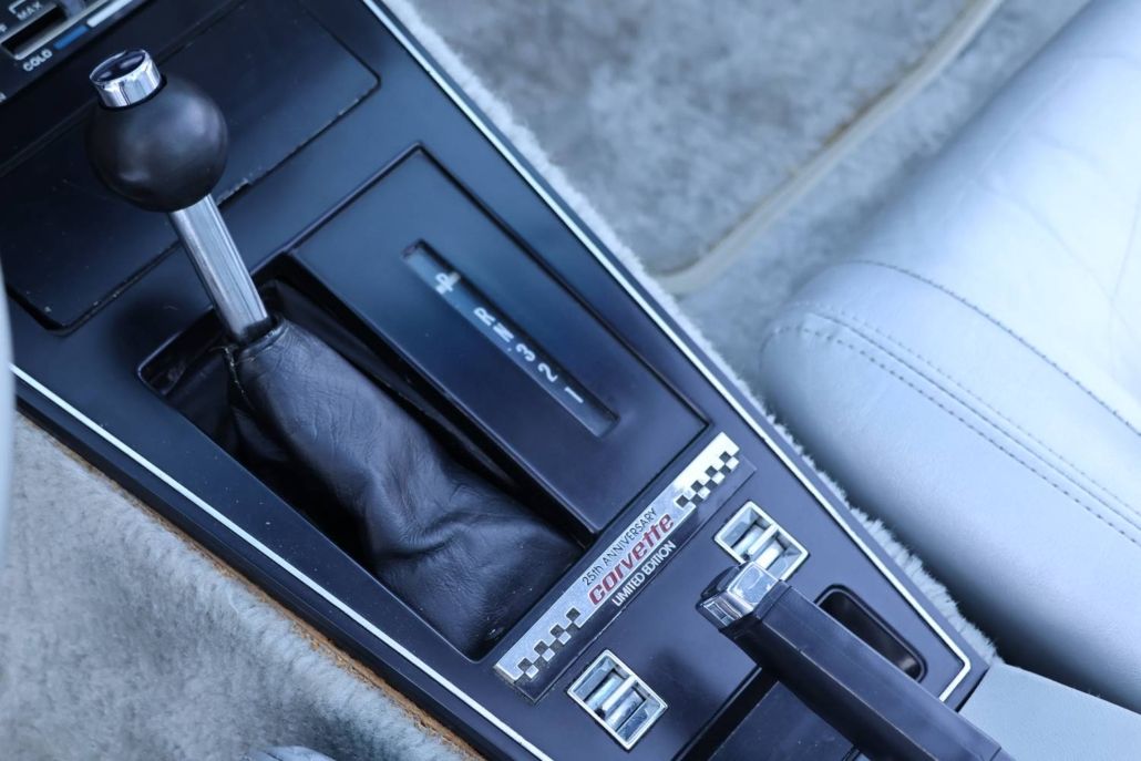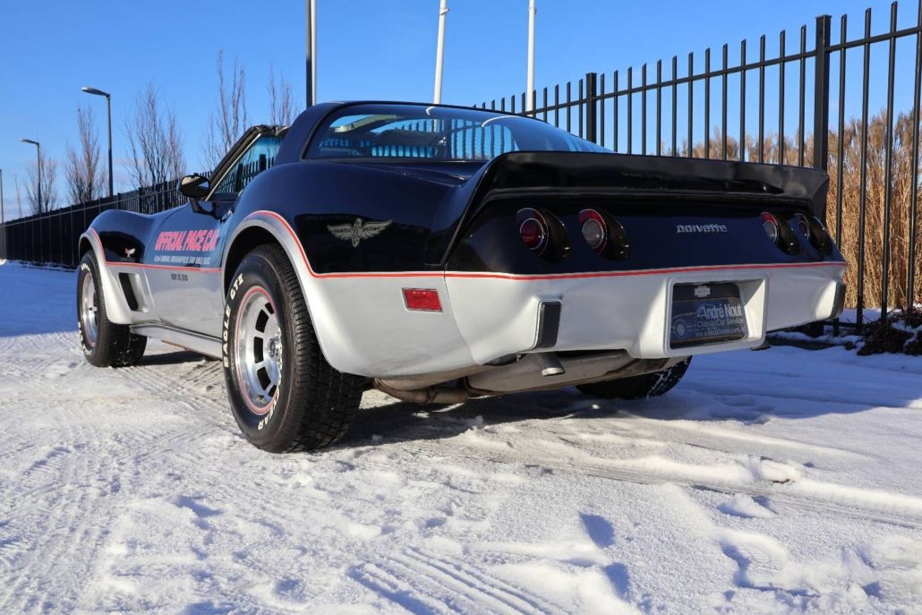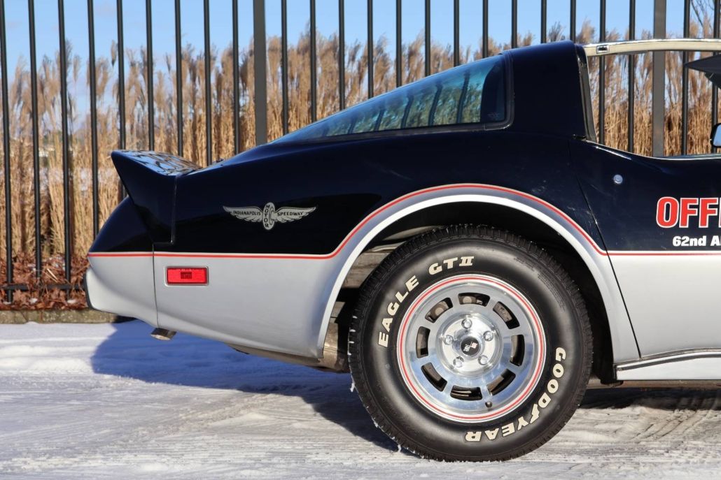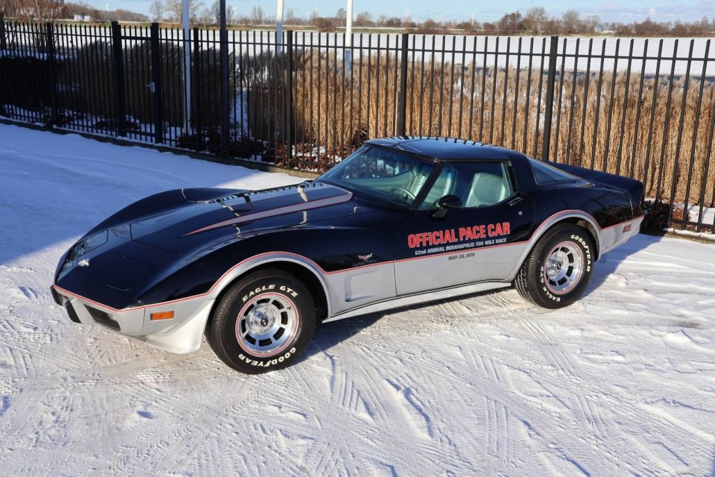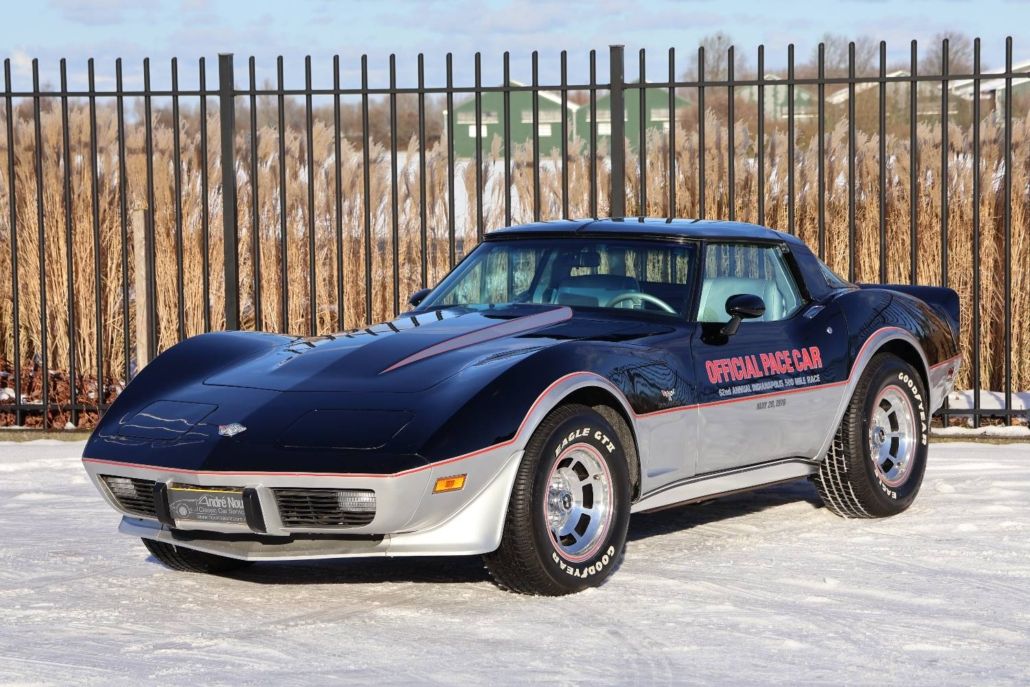 Chevrolet Corvette C3 targa silver anniversary edition from 1978. The model is the 25th anniversary edition, of which 6,502 units were produced. This matching numbers car has around 12,340 miles on the odometer and is in top original condition with original paintwork and interior. It is powered by a 5.7 liter L48 V8 engine delivering 185 hp, paired with a three speed automatic transmission. Top speed about 190 km/h. The car was the pace car for the Indianapolis 500 in 1978 and was displayed in the Technik Museum Sinsheim in Germany. It features a long black hood, two tone exterior black and silver, Silvergray leather interior, and 15 inch alloy wheels. Chassis number IZ87L8S901582. This is a unique item for any Corvette collection and is available for viewing in our showroom.