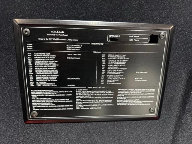 Ferrari 488 Pista Piloti Tailor Made. Tutti gli accessori extra presenti. Ufficiale Ferrari Italia. Versione limitata e numerata. Blu Tour de France. Interni in Alcantara Nera. Sedili Racing Carbonio taglia L. Cinture 4 punti. Fari led adattivi. Centrale sedili in Alcantara. Pinze freno Rosse. Pacchetto Carbonio Totale. Portelle anteriori in carbonio. Splitter aria laterali in carbonio. Allestimento Vano motore in Carbonio. Estrattore posteriore in Carbonio. Prese aria anteriori in Carbonio. Rivestimento sottoporta carbonio. Vela copristrumento Carbonio. Carbonio interno opaco. Modanatura interno braccando in carbonio. Tunnel superiore carbonio. Dettagli abitacolo colorati. Targhetta dedicata Argento. Kit Telemetria. Sollevatore lifting System. Cavallini cuciti su poggiatesta Rossi. Codini Scarico in Titanio. Estintore brandeggiabile. Sovratappeti colorati con logo. Collegatore posteriore in Carbonio. High Emotion Low Emission. Scudetti Ferrari. Navigatore. Bluetooth. Telecamera. Alzasedile sportivo. Sistema Audio integrato. Allestimenti Speciali. Cuciture Rosse. Freni Carboceramica. Volante extracampionario in Carbonio numero 22. Targhetta in carbonio opaco. Livrea Tricolore. Numero 22. Battitacco in Carbonio tailor Made. Pellicola PPF Totale. Tutti i tagliandi Ferrari. Tutta prima vernice. Pari al nuovo. Garanzia Ufficiale Ferrari. Tutta la dotazione originale. Libretti uso manutenzione e tagliandi.
