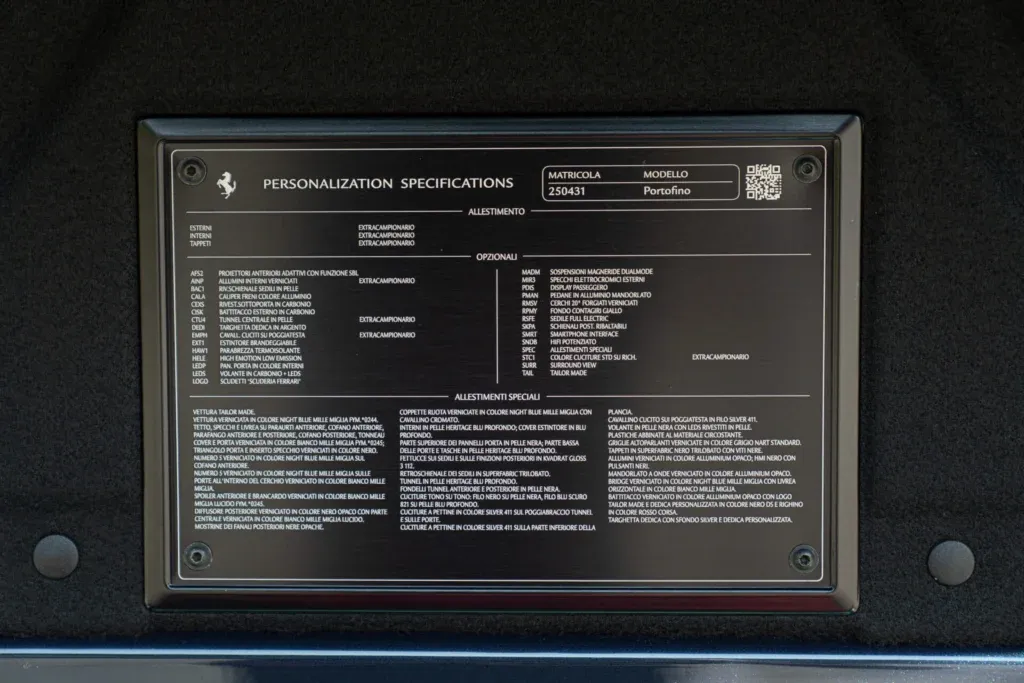 Portofino Tailor Made, 2020, Spider body, exterior color Night Blu Mille Miglia / Bianco Mille Miglia, Blu interior. 8-cylinder, displacement 3855 cc. Odometer 3,050 km. Transmission F1. Showroom: Reggio Emilia. Financing available.