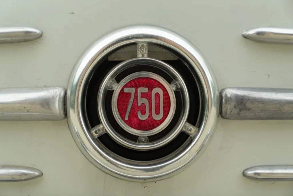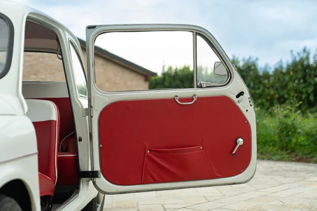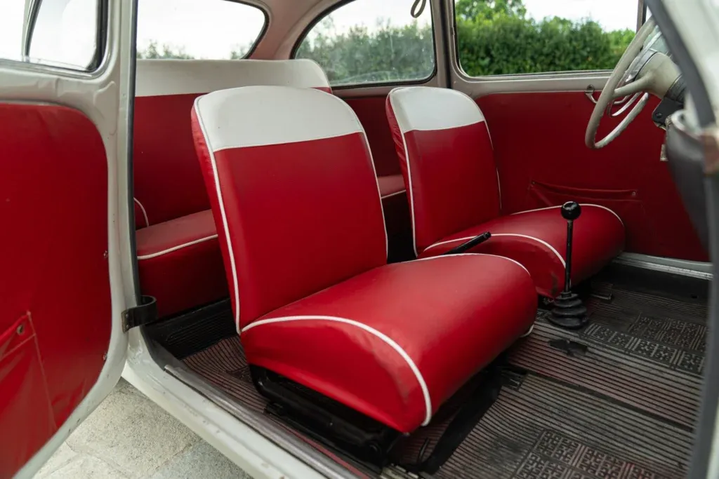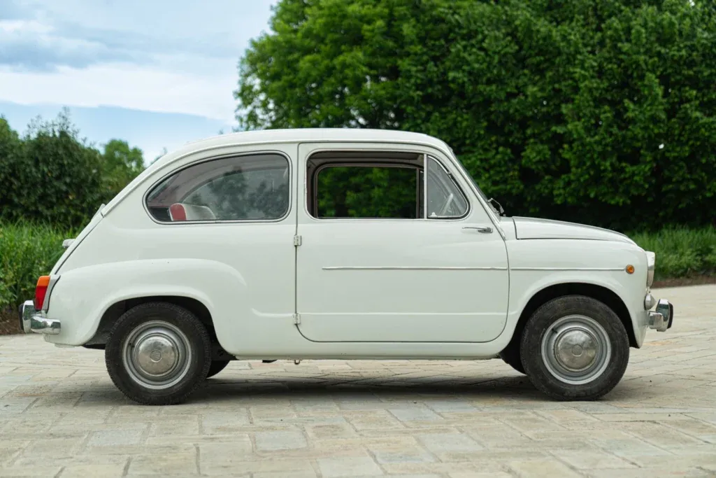 1963 FIAT 750 with 767cc displacement, 4 cylinders, manual transmission. Exterior color Bianco, interior color RossoBianco. Odometer 65,594 km. Showroom: Reggio Emilia. Registration: ASI – Italian Historic Automobile Club. Code FIA00424.