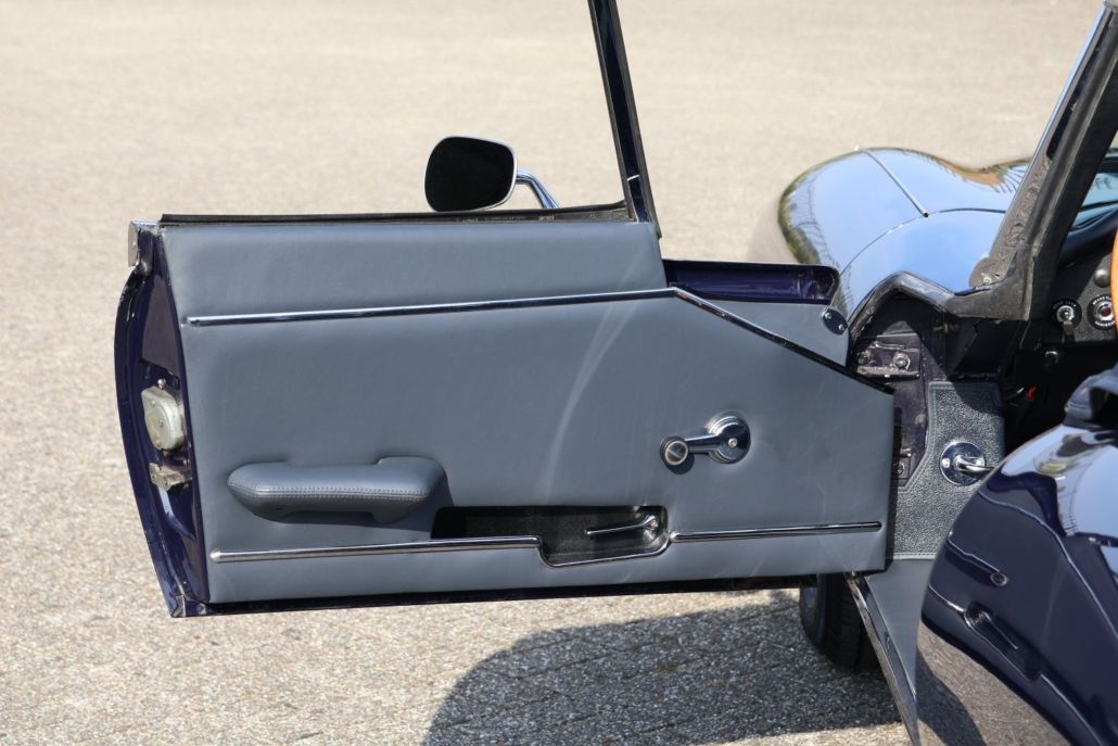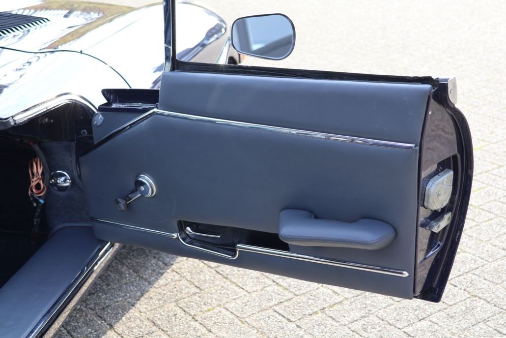 Once again we may offer you a very nice jaguar E Type. This time a second series in one of the best possible color combinations. Dark blue with blue leather and a blue soft top. This car is perfect for lovers of scenic drives, tour rallies or other car adventures. The Belgian registered car has been known and maintained by us for quite some time. Technically always brought to us after every tour for servicing and also optically no effort has been spared to keep it in top condition. The soft top was recently replaced and also the entire interior in top quality blue leather with matching blue carpet. The wheels are the wider type chrome spoke “competition style ”. Further modifications include an aluminum radiator and stainless steel exhaust including manifold. In the car there is a connection point for a Monit trip master with dual sensors on the front wheel hubs and connection points for charging phones etc. Driving this E type is great, the 4.2 engine provides plenty of torque and the whole car is easy to handle. You just feel that this is a car that has been handled well and reliability is extremely good due to regular use. The best way to experience this is to visit our showroom and thoroughly inspect and drive the Jag. We dare you to, after such a visit it is almost impossible to leave it.