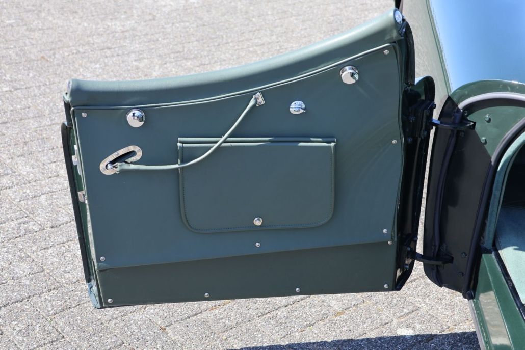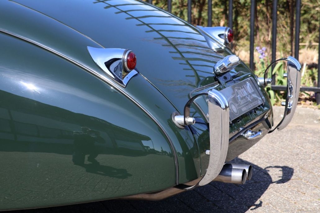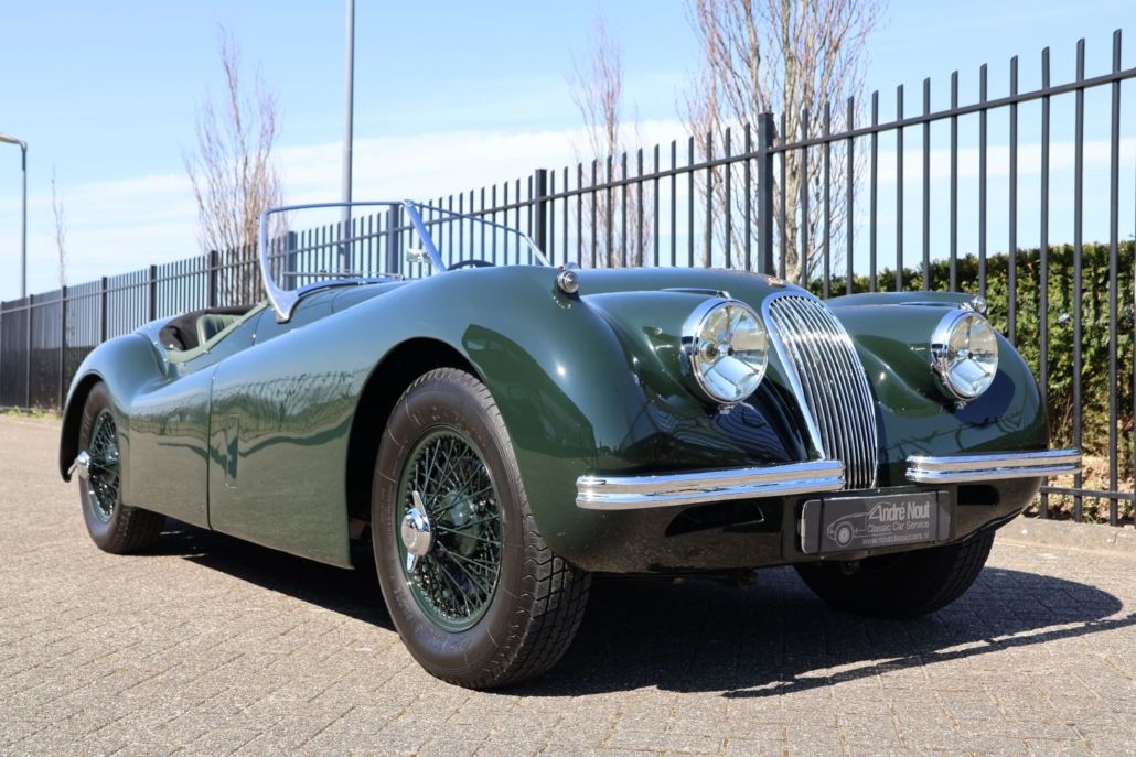Jaguar XK120 OTS SE, an open two-seater in Jaguar racing green with suede green leather interior. The car dates from May 1954 and has an extensive restoration history: from 1999 to 2017 it was overhauled, then owned by Pierre Potet (France) until 2021, and by its current Dutch owner since 2024. Upgrades include overhaul of the fuel system with HD8 carburetors, adjustable telescopic shock absorbers, new 60-spoke rims in body color with Michelin tires, odometer overhaul, spin-on oil filter conversion, 123 electronic ignition, new batteries, pedal modification for taller drivers, and other enhancements such as buckets seats and an aluminum radiator with header tank. The car runs with a rebuilt matching engine, four-speed transmission, and delivers a powerful, refined driving experience. It is described as a perfect XK120 OTS SE ready for touring or rally.