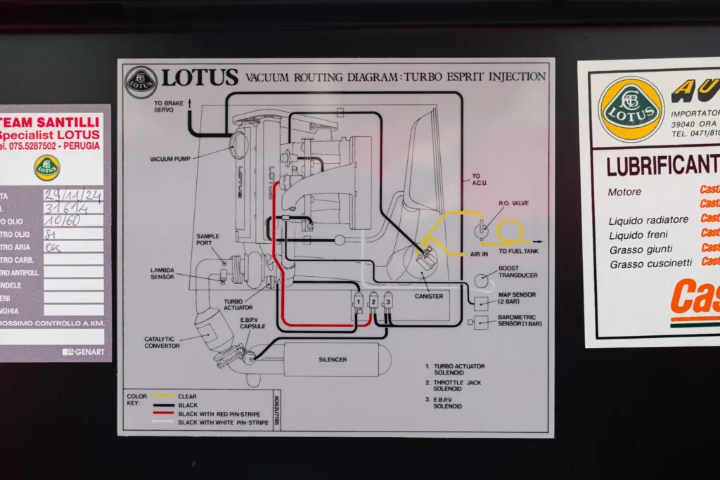 La Espirit fu disegnata da Giugiaro nel 1972 e protagonista al cinema con James Bond e Pretty Woman. La Lotus Esprit Turbo 2.0 allestimento SE (Special Equipment) monta un motore 4 cilindri in linea da 2.0 litri turbocompresso, con 243 CV (179 kW), capace di raggiungere i 263 km/h e un'accelerazione da 0 a 100 km/h in circa 5,4 secondi. Questa vettura fu prodotta dal 1991 al 1993. La vettura in oggetto è stata prodotta il 26 novembre del 1991. Importata da Autoexpo, importatore Lotus per Italia. Immatricolata nel 1992. Dotata di High Wing (alettoni alto) colore calypso red e interni in pelle Magnolia. N. 5 delle 13 prodotte di questo colore. Accessoriata con tetto in cristallo (rimovibile). Originale in Tutto. A.S.I. targa oro n 59196.