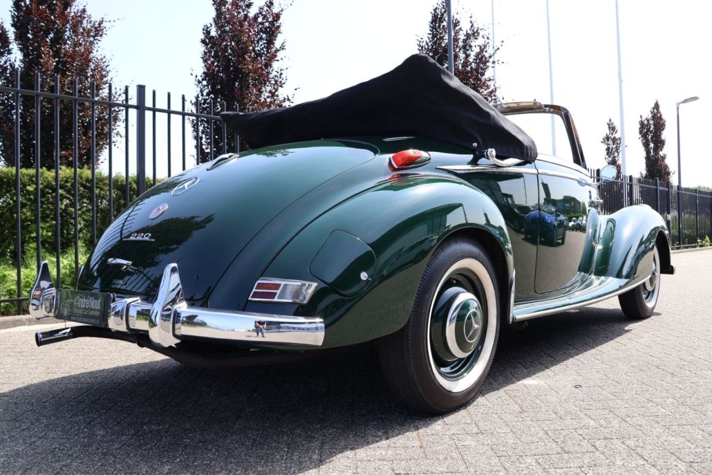 This Mercedes 220 A convertible, with only 1278 built, is an exclusive and rare appearance. Dating from 1952 and belonging to the so-called W187 series which was built from 1951 to 1955. Equipped with a 2.2 liter six-cylinder engine, coupled to a four-speed manual transmission and a very elegant bodywork, the car appeals to a wide range of Mercedes and other classic car enthusiasts. In this dark green color, combined with the gray leather, this 220 presents itself perfectly. The car has been thoroughly restored in the past and, after being owned for a long period by the same owner, has now been extensively serviced by us. Driving this car is truly like traveling in a time capsule. The six-cylinder engine produces a beautiful sound, typical of Mercedes and ensures that the car can still keep up well in today’s traffic. It feels most at home on beautiful country roads, with the convertible top open and the windows down it makes you relax. If you want to experience this feeling yourself, we would like to invite you for a viewing and possibly a test drive.