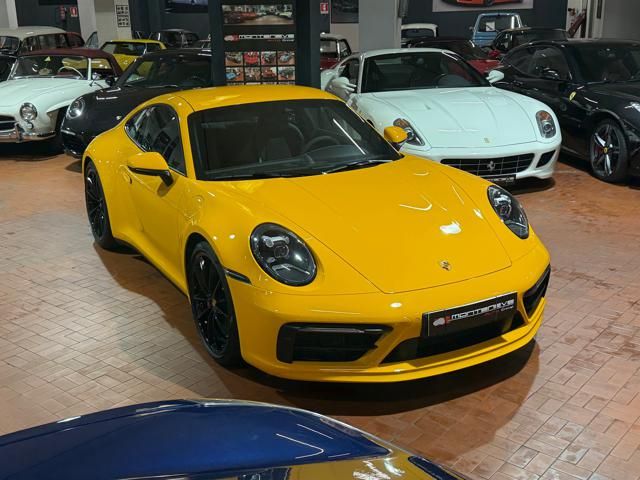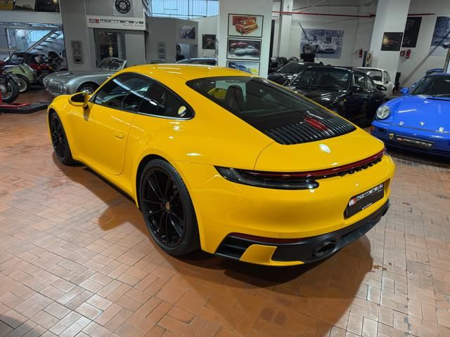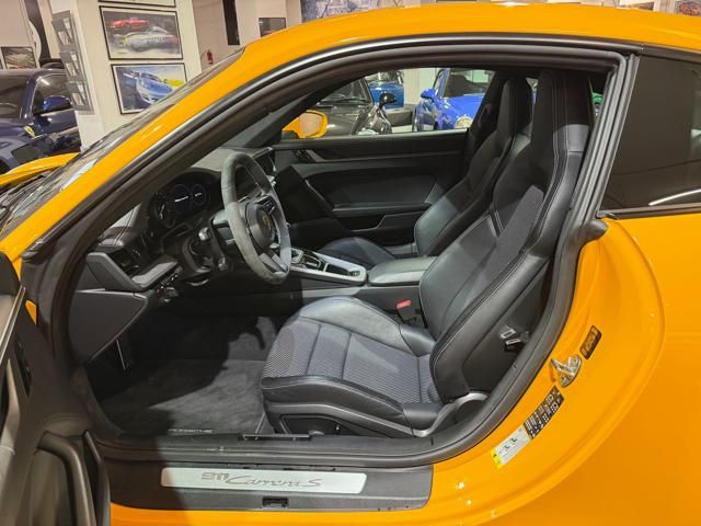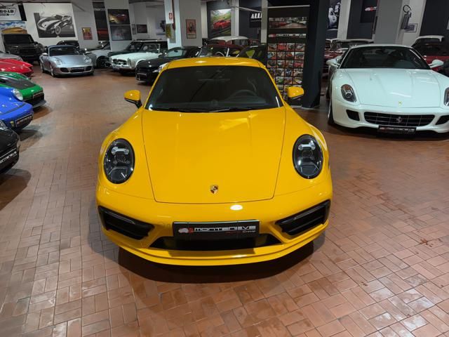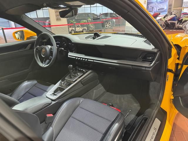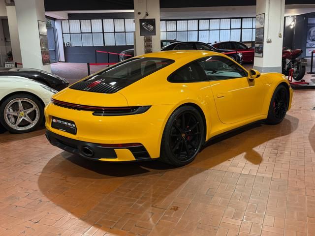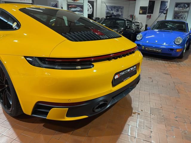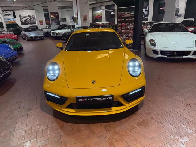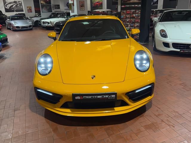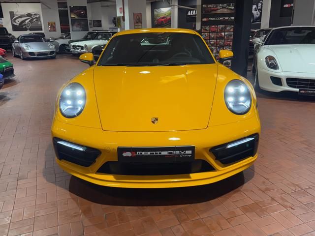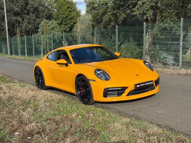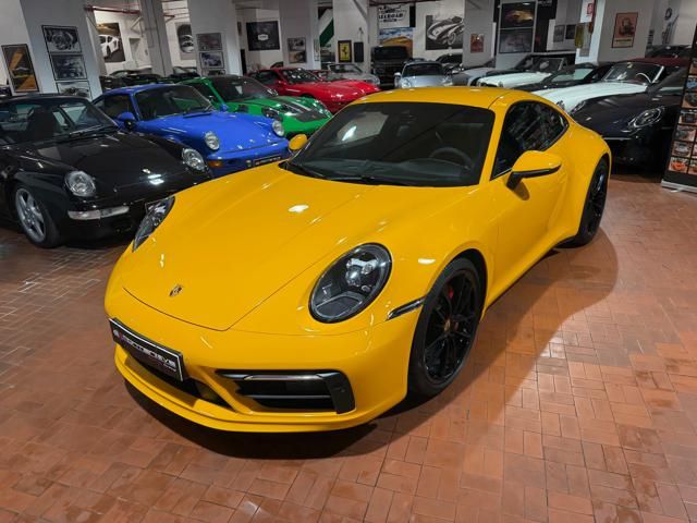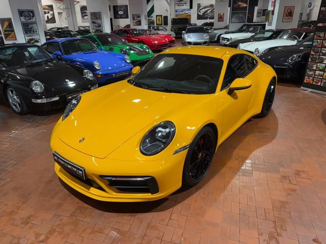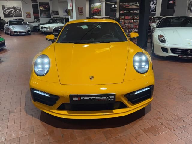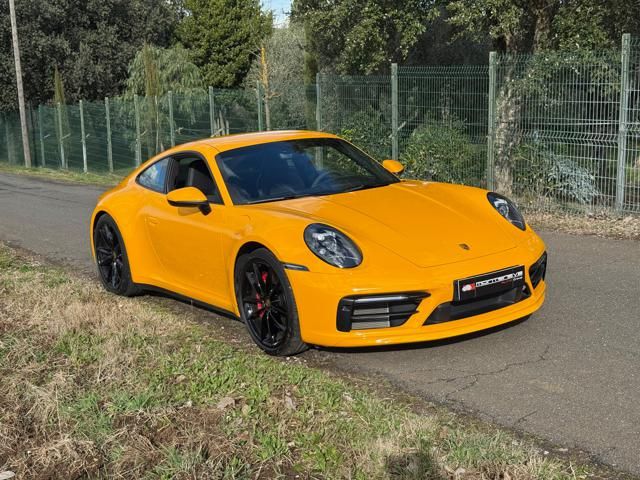 Porsche 911 Carrera S (992) with 7-speed manual gearbox. Exterior Giallo Signal PTS; interior Black leather with technical Sportex fabric. Features include electrically adjustable sport seats (heated), Sport Chrono Plus, rear camera, GT sport steering wheel in Alcantara (heated), white stitching, leather dashboard, bi-zone automatic climate control, SportDesign exterior pack, sport exhaust with Techart carbon tips, 20/21 Carrera Classic wheels in gloss black, front and rear ParkAssist, PASM active suspension lowered by 10 mm, four-wheel steering, Porsche Connect Plus, PCM navigation, Bluetooth, WLAN, Apple CarPlay, vehicle localization, Cruise Control, PDLS+ LED headlights, dynamic turning signals, tire pressure monitoring, and more. Full Porsche service history with service stamp up to 02/2026. VAT included. Located in Rome at Via A. De Viti de Marco 48.