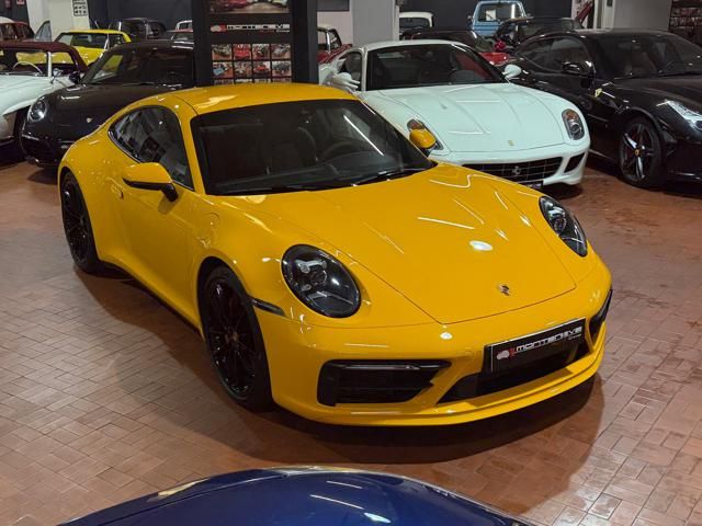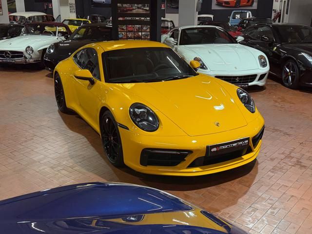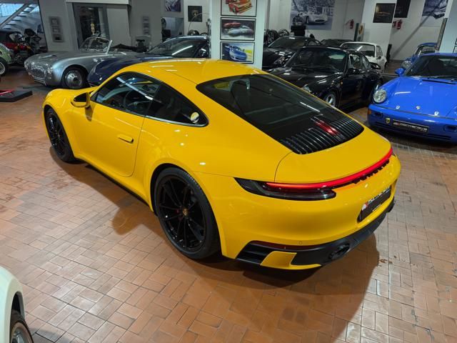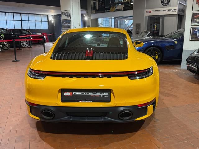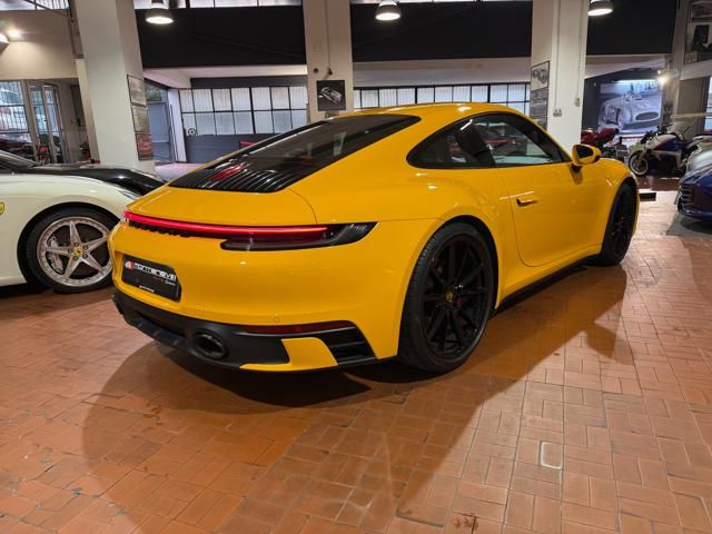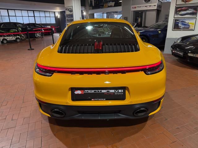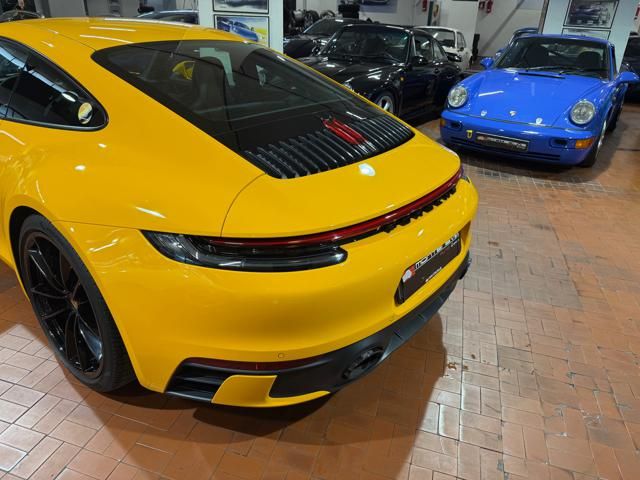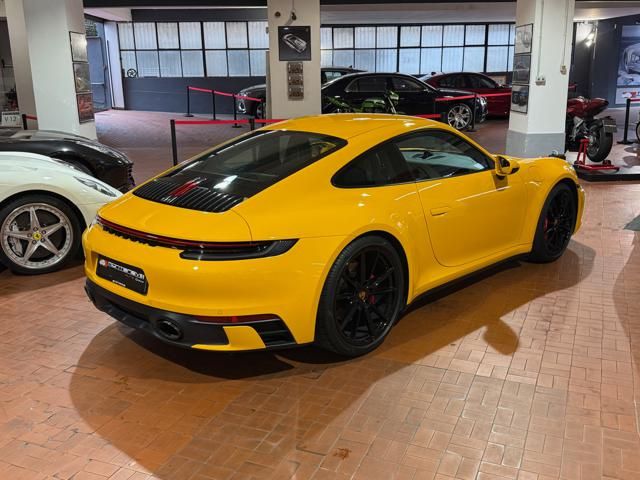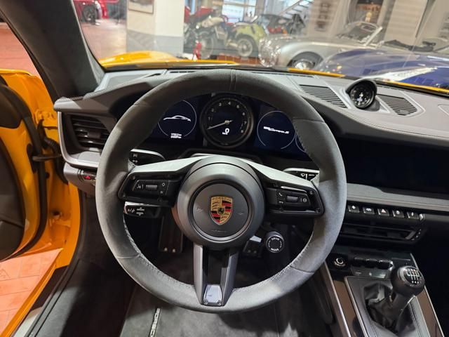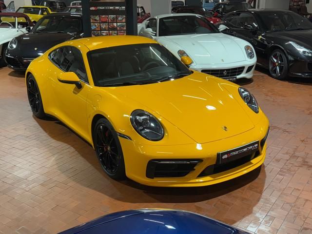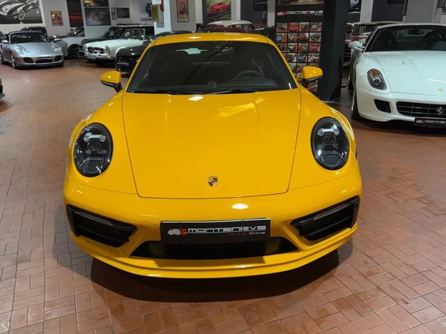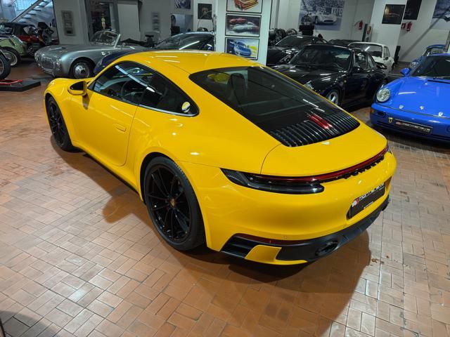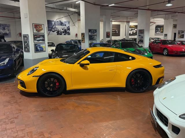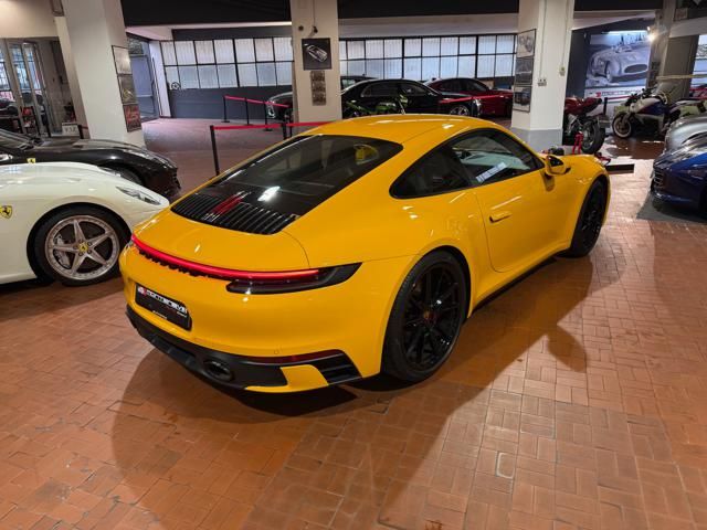 Porsche 911 Carrera S (992) with 7-speed manual gearbox. Exterior Giallo Signal PTS; interior Black leather with technical Sportex fabric. Features include electrically adjustable sport seats (heated), Sport Chrono Plus, rear camera, GT sport steering wheel in Alcantara (heated), white stitching, leather dashboard, bi-zone automatic climate control, SportDesign exterior pack, sport exhaust with Techart carbon tips, 20/21 Carrera Classic wheels in gloss black, front and rear ParkAssist, PASM active suspension lowered by 10 mm, four-wheel steering, Porsche Connect Plus, PCM navigation, Bluetooth, WLAN, Apple CarPlay, vehicle localization, Cruise Control, PDLS+ LED headlights, dynamic turning signals, tire pressure monitoring, and more. Full Porsche service history with service stamp up to 02/2026. VAT included. Located in Rome at Via A. De Viti de Marco 48.