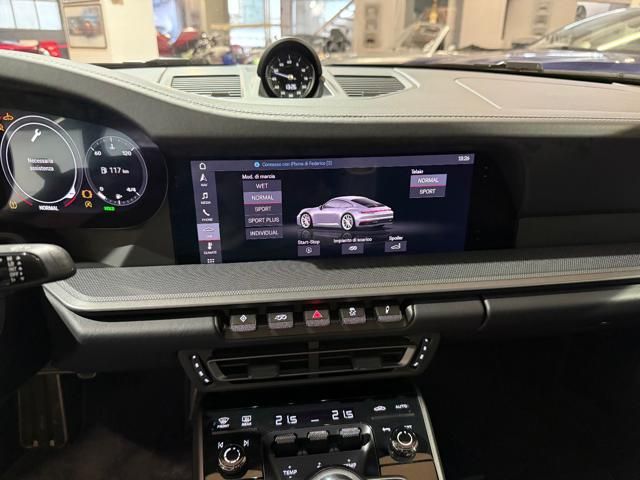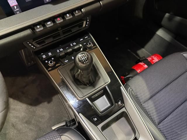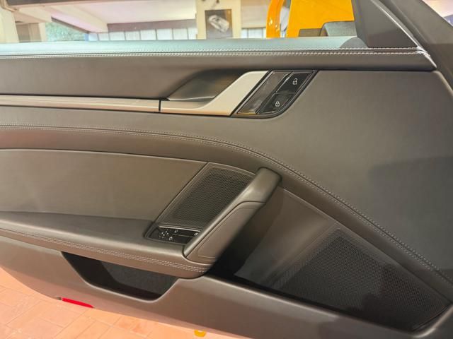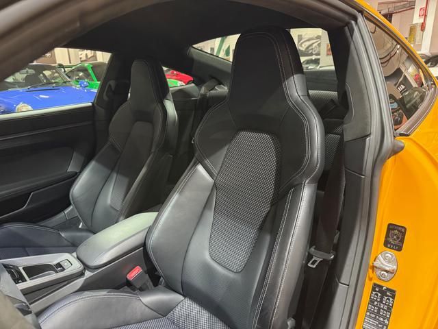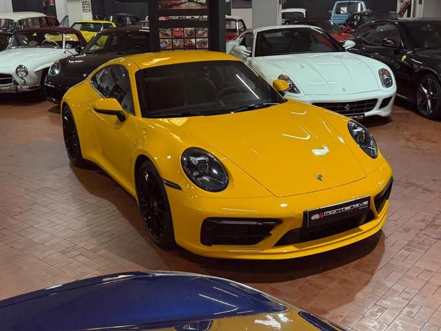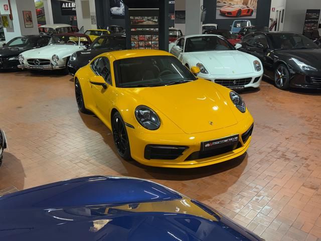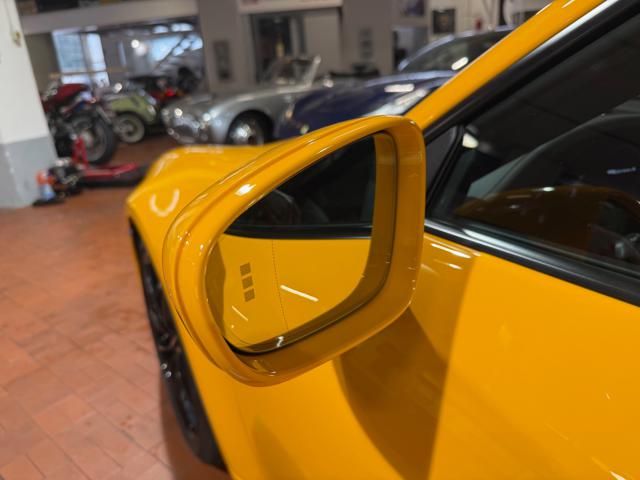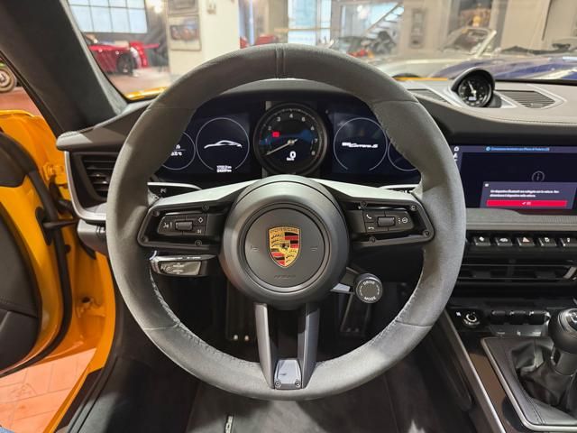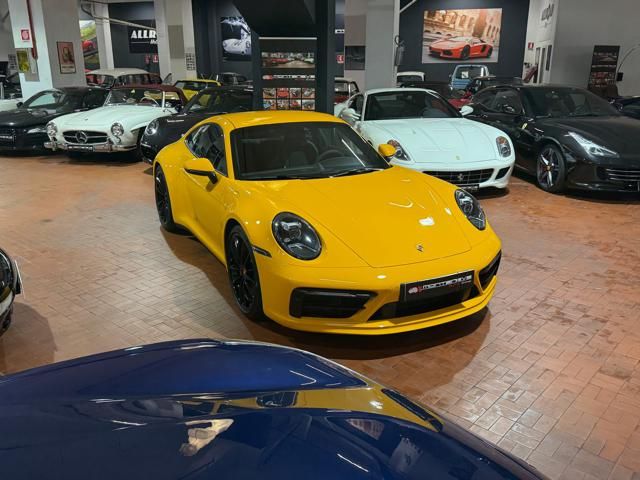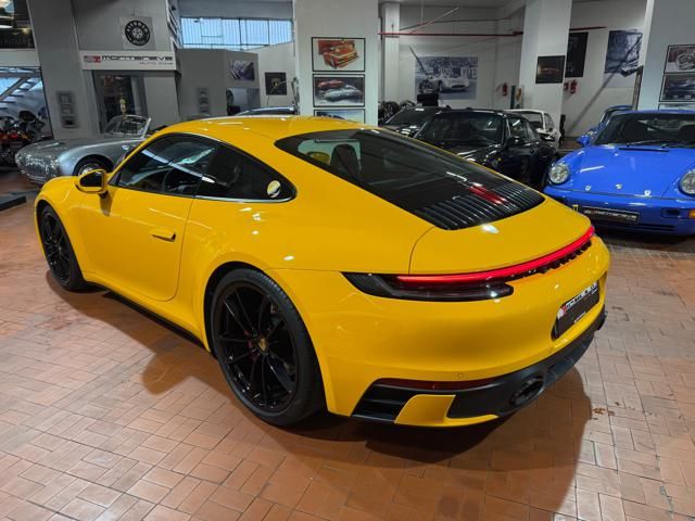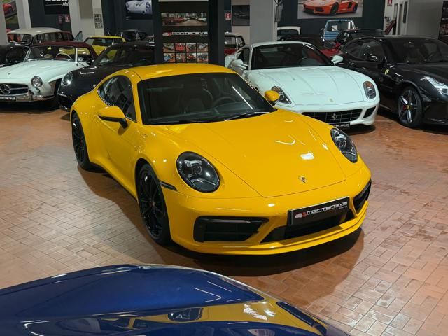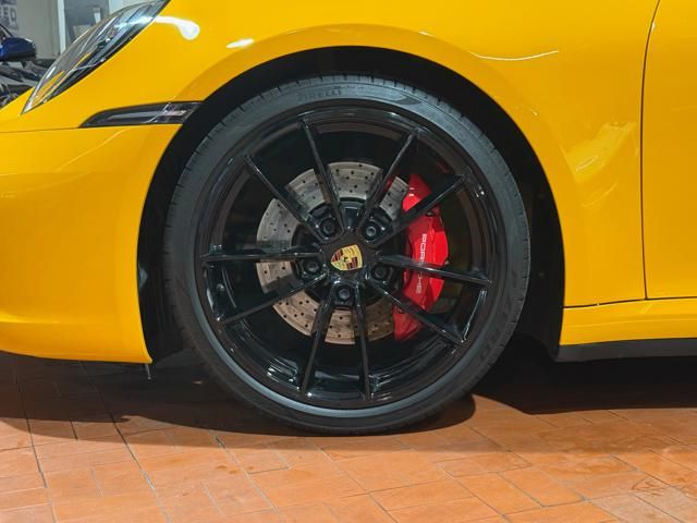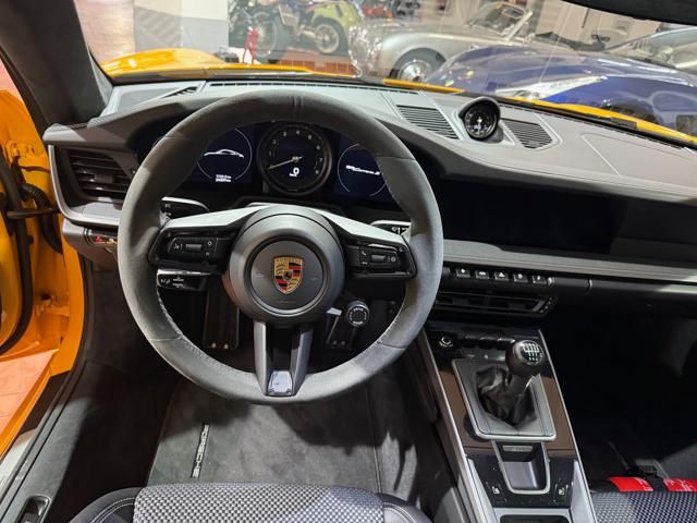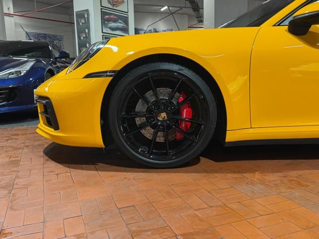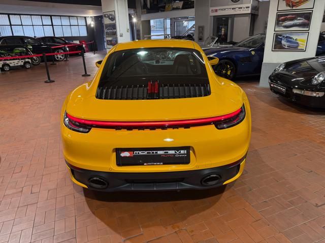 Porsche 911 Carrera S (992) with 7-speed manual gearbox. Exterior Giallo Signal PTS; interior Black leather with technical Sportex fabric. Features include electrically adjustable sport seats (heated), Sport Chrono Plus, rear camera, GT sport steering wheel in Alcantara (heated), white stitching, leather dashboard, bi-zone automatic climate control, SportDesign exterior pack, sport exhaust with Techart carbon tips, 20/21 Carrera Classic wheels in gloss black, front and rear ParkAssist, PASM active suspension lowered by 10 mm, four-wheel steering, Porsche Connect Plus, PCM navigation, Bluetooth, WLAN, Apple CarPlay, vehicle localization, Cruise Control, PDLS+ LED headlights, dynamic turning signals, tire pressure monitoring, and more. Full Porsche service history with service stamp up to 02/2026. VAT included. Located in Rome at Via A. De Viti de Marco 48.